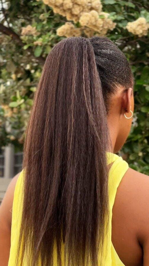 A clip-in ponytail with a kinky straight hair texture, this product is the ultimate hair accessory you need to add length and volume to your ponytail in a matter of minutes. With natural blending and an easy application, this is your go-to solution for adding length and volume to your natural hair with no permanent change or damage. These extensions can be safely heat-styled to straighten or curl, the kink will return once the hair is wet.